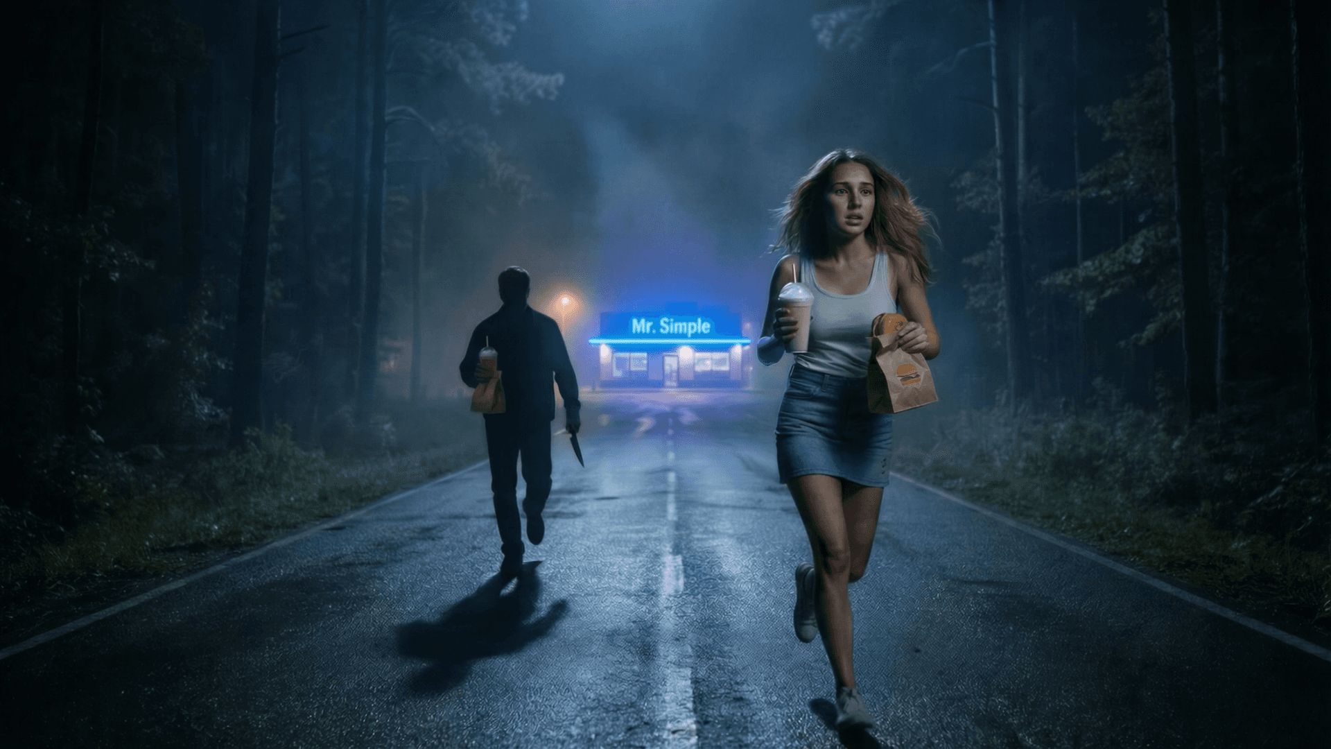 We took a classic slasher chase and asked a simple question: What if the final girl just needed a combo meal?